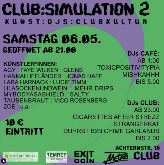 Verantwortlich zeichnet dafür das Exitocin Kollektiv. Noch nicht davon gehört? Keine Sorge, das liegt nicht an euch: „Exitocin existiert erst seit etwa anderthalb Jahren“, erklärt Stephan stellvertretend für die Gruppe. „Wir sind ein Zusammenschluss von sechs Personen, teilweise DJs, die aus Oldenburg, Bremen, Osnabrück und Münster kommen.“ Dass sie zusammenfanden, ist aber kein geographischer Zufall, sondern hat eine inhaltliche Ursache: „Uns liegt viel daran, dass der Club ein sicherer, fairer und bildender Ort ist.“ Und in diese gemeinsame Haltung passt das Format „Club:Simulation“ perfekt.